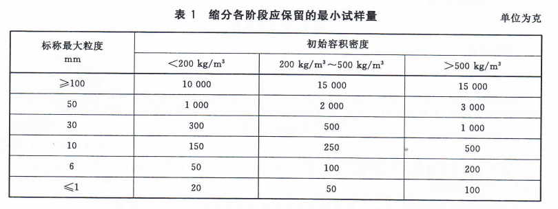 4.1樣品縮分后的最小試樣量:表1給出了每一縮分階段應(yīng)保留的最小樣品質(zhì)量,它主要取決于物料的標(biāo)稱最大粒度和容積密度。標(biāo)稱最大粒度可通過篩分試驗確定,容積密度的測定方法見附錄C,部分物料的初始容積密度參見附錄D。除了表1中說明的最小質(zhì)量之外,還應(yīng)保證縮分后的樣品量能滿足實際試驗的需要。